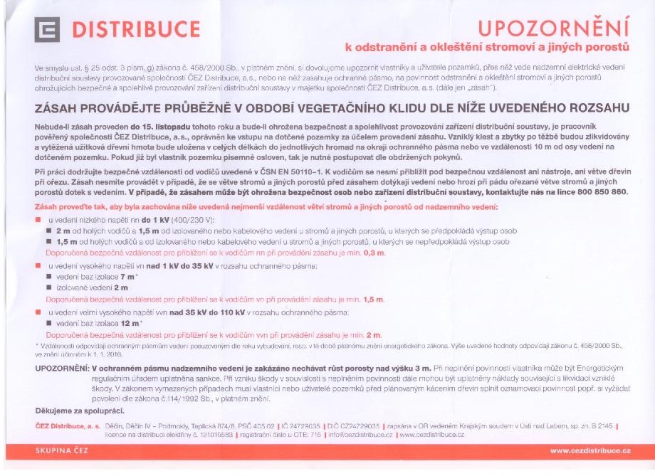 Úvod > Obec > Aktuality > ČEZ - upozornění k odstranění a okleštění stromoví a jiných porostů