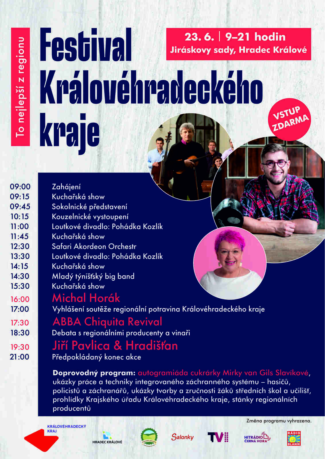Pozvánka na akci Festival Královéhradeckého kraje, který se koná v Jiráskových sadech v Hradci Králové v pátek 23.6.2023 od 9 do 22 hodin.