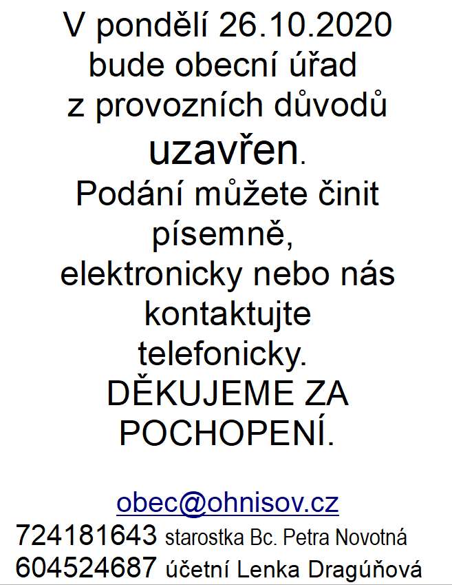 INFORMACE - UZAVŘENÍ PROVOZU OBECNÍHO ÚŘADU 26.10.2020