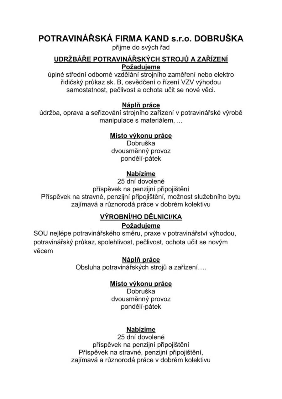 Kand s.r.o. Dobruška - nabídka pracovních míst