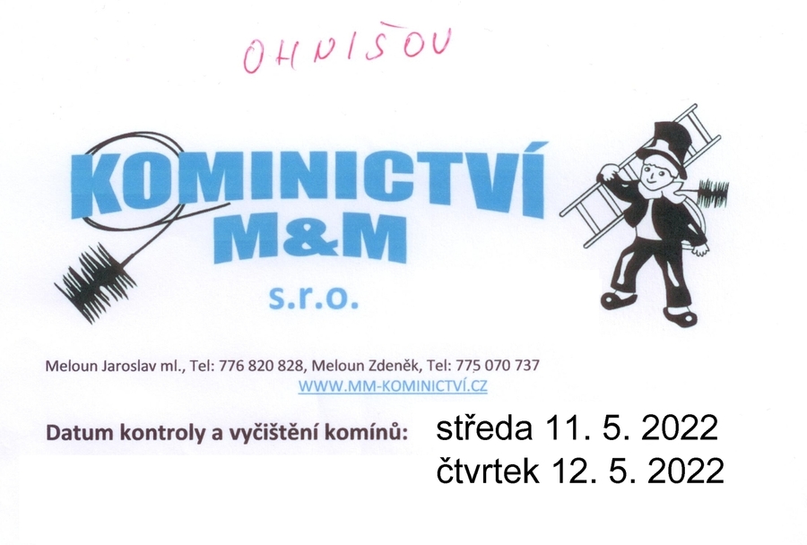 Ve středu 11. května a ve čtvrtek 12. května bude u nás v obci provádět firma Kominictví M@M pravidelné čištění a revize komínů. Zájemci se mohou zapisovat do seznamů na chodbě v budově obecního úřadu, službu mohou objednat emailem nebo sms zprávami na kontaktech obce (obec@ohnisov.cz, ucetni@ohnisov.cz, mob. 732385030).