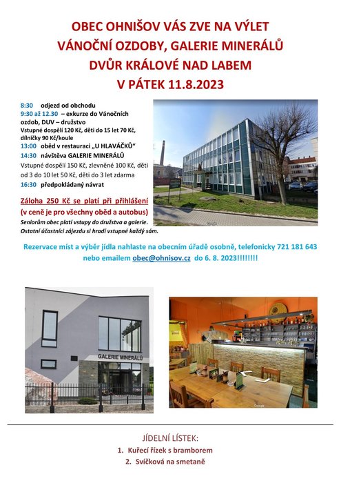 OBEC OHNIŠOV VÁS ZVE NA VÝLET VÁNOČNÍ OZDOBY, GALERIE MINERÁLŮ DVŮR KRÁLOVÉ NAD LABEM V P