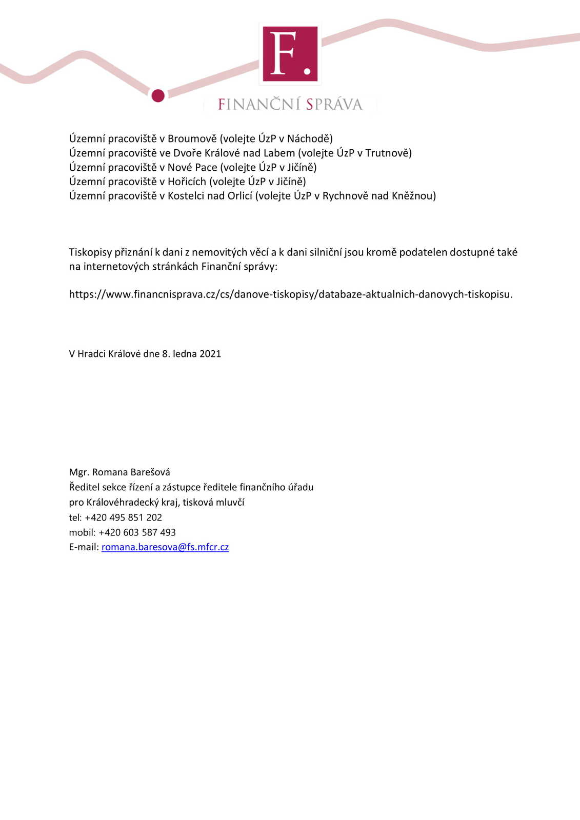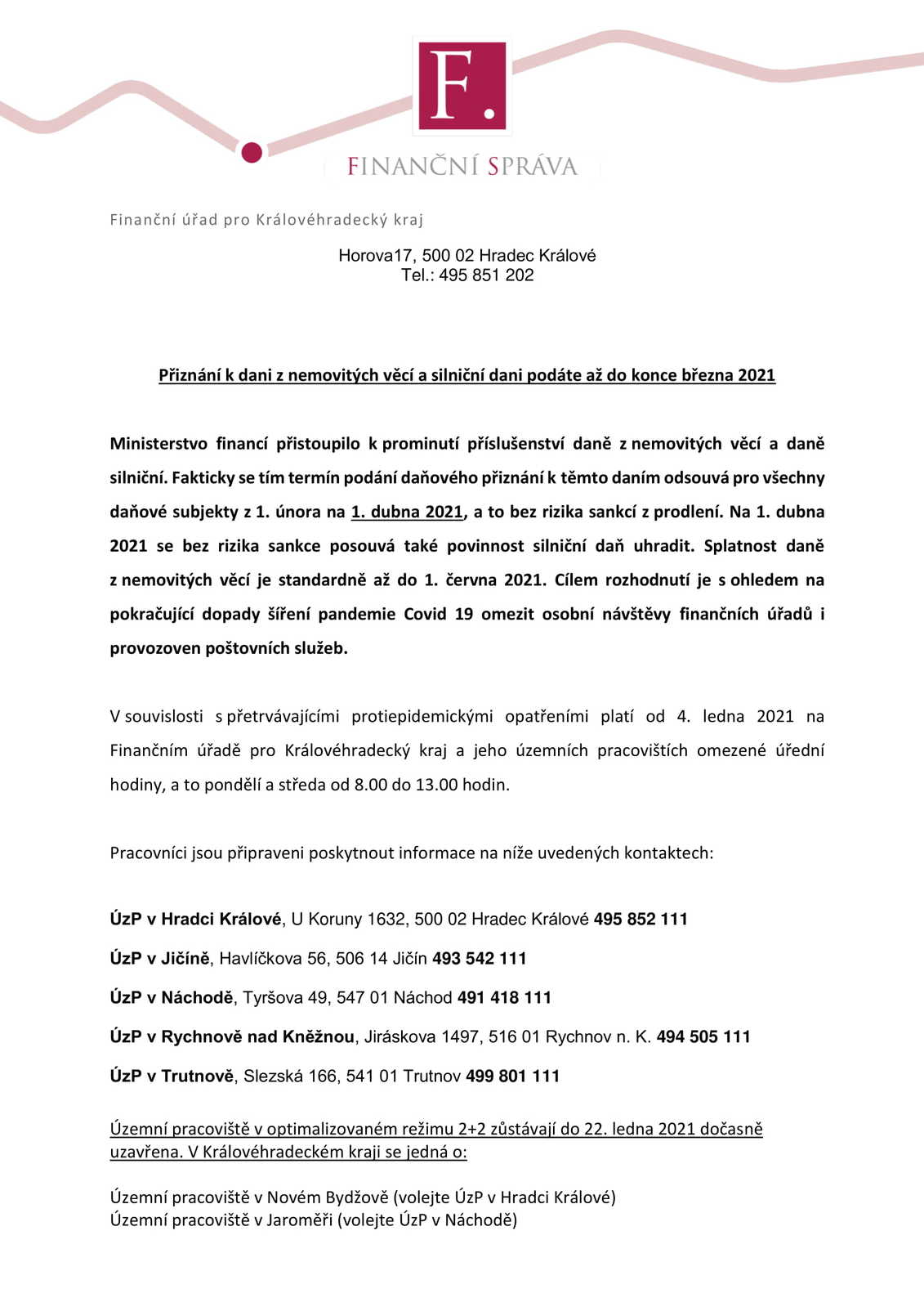Úvod > Obec > Aktuality > OZNÁMENÍ FINANČNÍ SPRÁVY - daň z nemovitých věcí a silniční daň