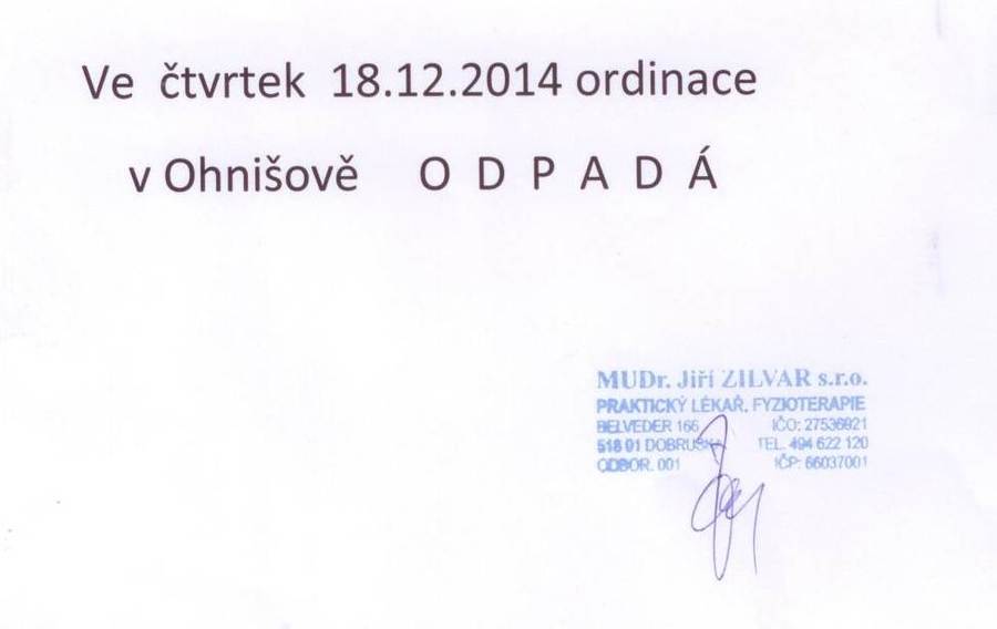Oznámení - MUDr. Zilvar 18.12. neordinuje v Ohnišově