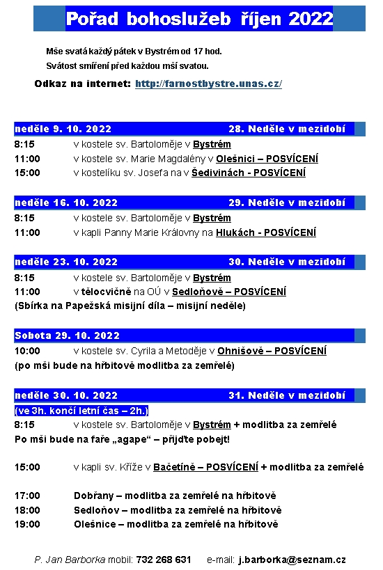 Úvod > Obec > Aktuality > Pořad bohoslužeb v naší farnosti v říjnu 2022 (posvícení, modlitby za zemřelé na hřbitově)