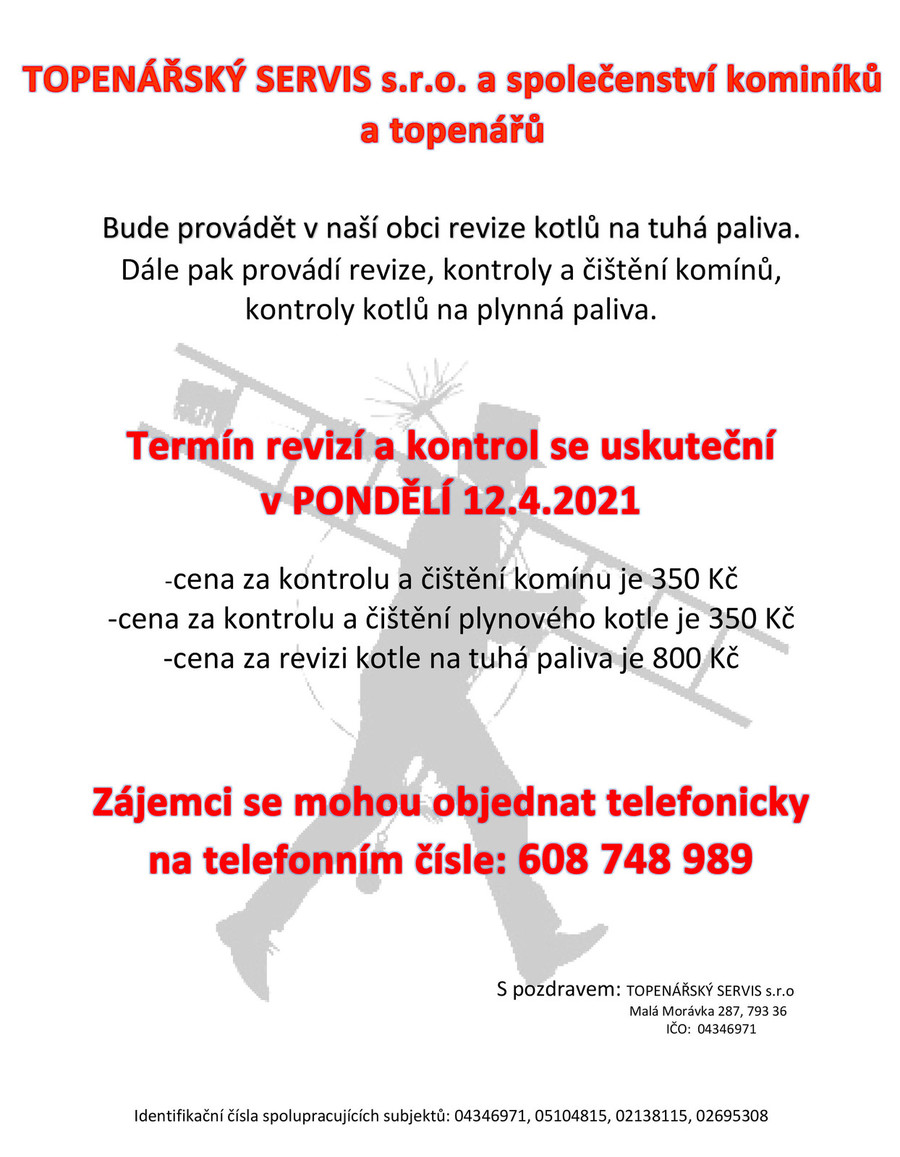 Úvod > Obec > Aktuality > TOPENÁŘSKÝ SERVIS s.r.o. a společenství kominíků a topenářů - oznámení