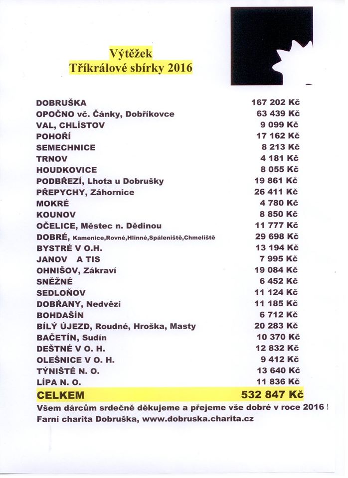 Výsledky tříkrálové sbírky DOBRUŠSKO