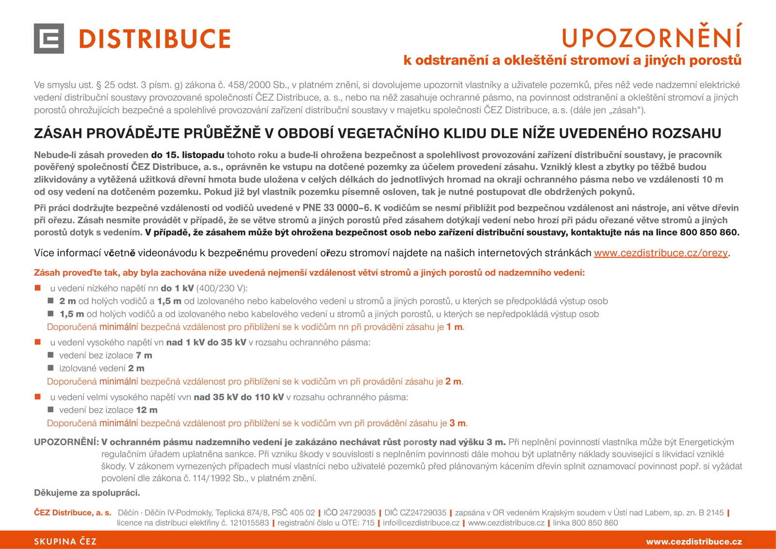 k pravidelnému odstraňování a oklešťování stromoví a jiných porostů ohrožujících bezpečné a spolehlivé provozování zařízení distribuční soustavy v majetku společnosti ČEZ Distribuce, a. s., jakožto provozovatele distribuční soustavy. V ochranném pásmu nadzemního vedení je zakázáno nechávat růst porosty nad výšku 3 m. Ochranné pásmo nadzemního vedení je souvislý prostor vymezený svislými rovinami vedenými po obou stranách vedení ve vodorovné vzdálenosti měřené kolmo na vedení (vzdálenosti se řídí ustanovením § 46 odst. 3 energetického zákona, v platném znění). Odstraňování a oklešťování stromoví a jiných porostů se provádí v období vegetačního klidu a dle zákona č. 114/1992 Sb., o ochraně přírody a krajiny, v platném znění. Pokud vlastník či uživatel pozemku neodstraní stromoví a jiné porosty ani po předchozím upozornění a stanovení rozsahu, má provozovatel distribuční soustavy právo odstraňovat a oklešťovat stromoví a jiné porosty, provádět likvidaci odstraněného a okleštěného stromoví a jiných porostů ohrožujících bezpečné a spolehlivé provozování zařízení distribuční soustavy.