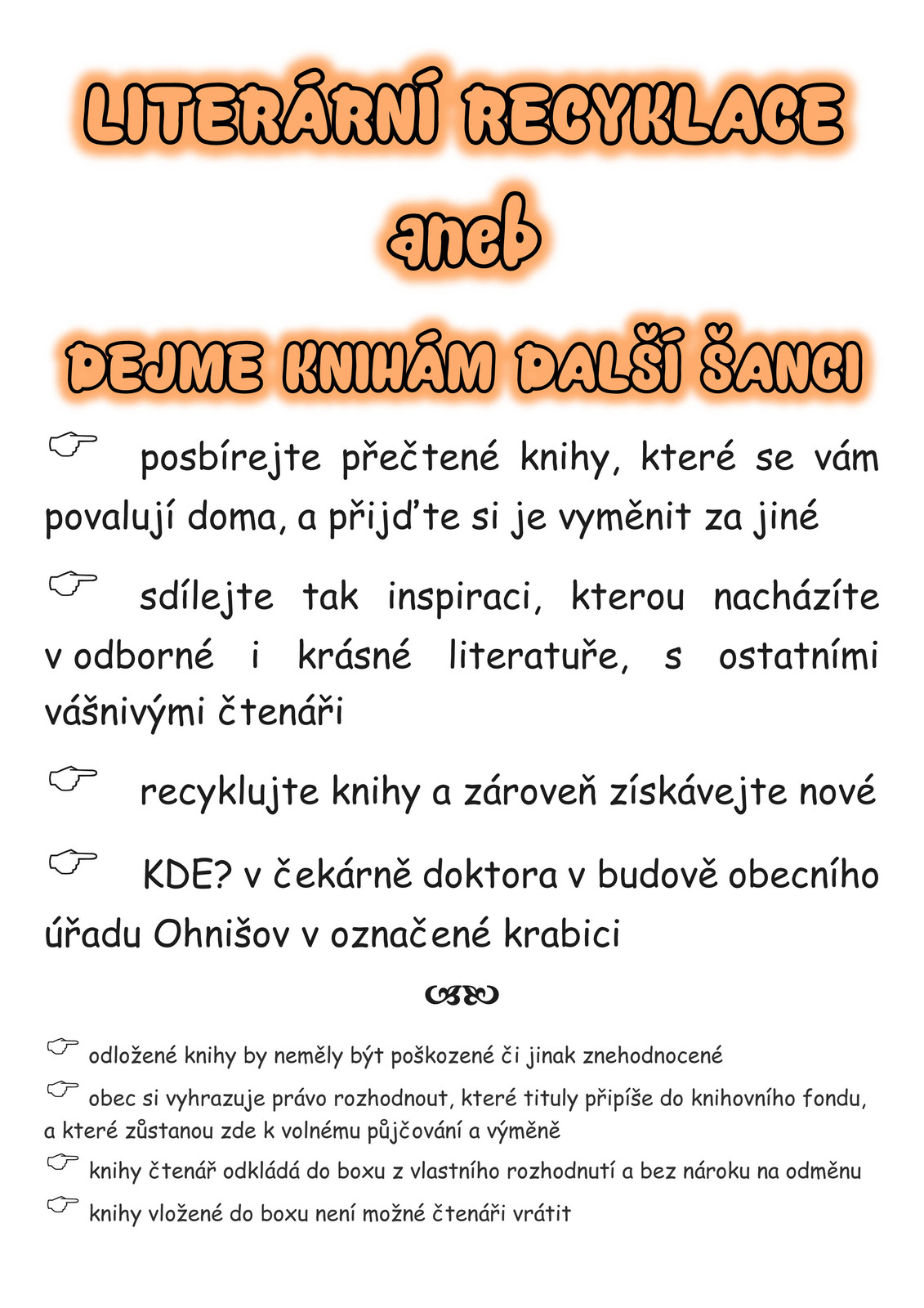 V čekárně doktora v přízemí je skříň (původně pouze označená krabice - chybně uvedeno ještě v textu letáku) v rámci akce LITERÁRNÍ RECYKLACE aneb DEJME KNIHÁM DRUHOU ŠANCI (více leták níže).