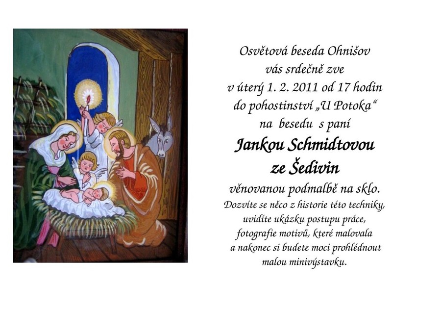 1.2.2011 od 17.00 hodin v pohostiství "U Potoka" beseda s Jankou Schmidtovou ze Šedivin o podmalbě na skle - 40 lidí