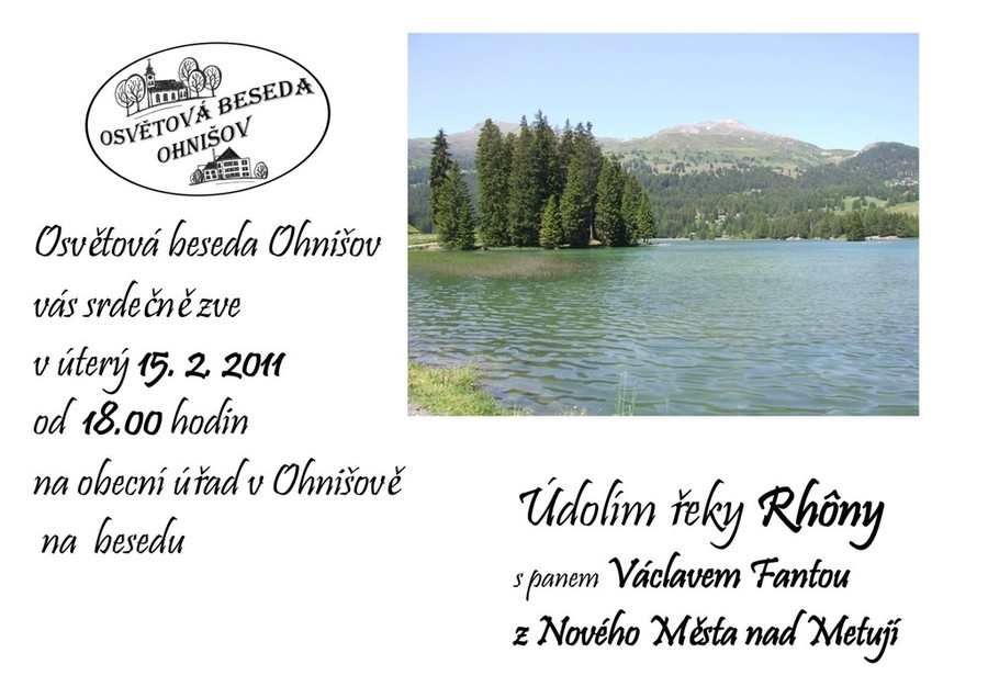 15.2.2011 od 18.00 hodin v kanceláři obecního úřadu beseda "Údolím řeky Rhôny" s panem Václavem Fantou z Nového Města nad Metují