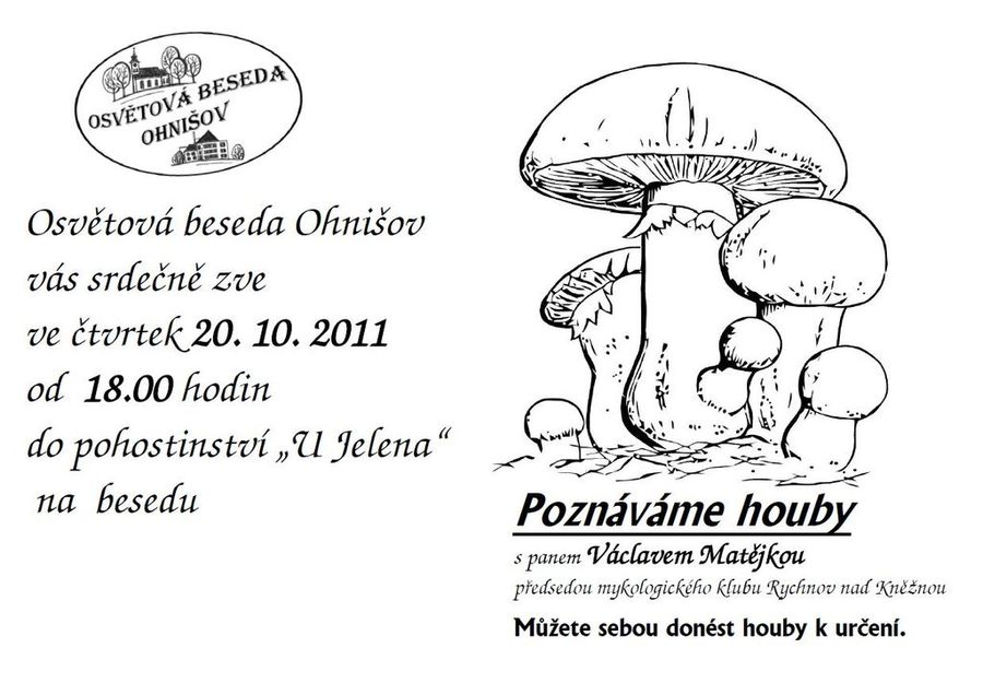 20.10.2011 od 18.00 hodin v pohostinství "U Jelena" povídání "Poznáváme houby" s předsedou mykologického klubu Rychnov nad Kněžnou panem Václavem Matějkou