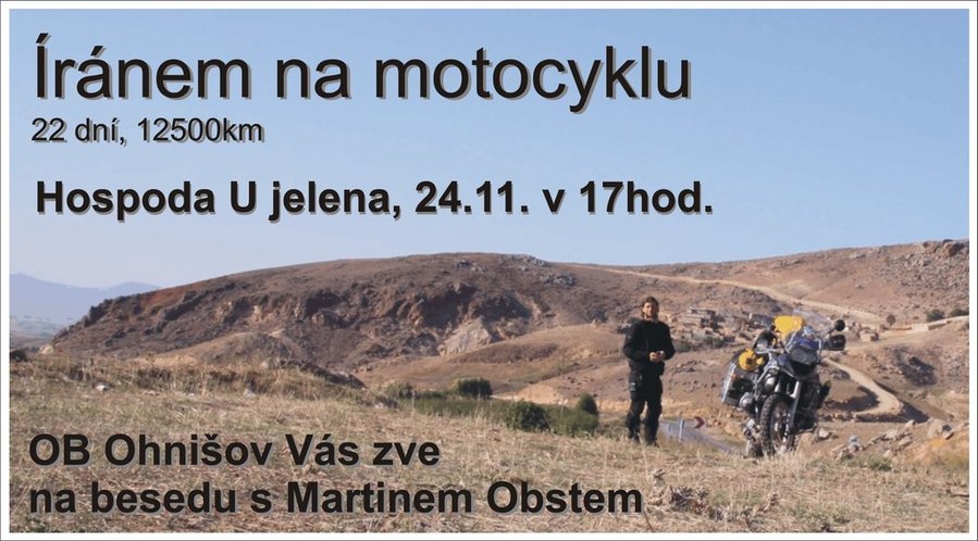 24.11.2011 od 17. 00 hodin v pohostinství "U Jelena" beseda Íránem na motocyklu s panem Martinem Obstem